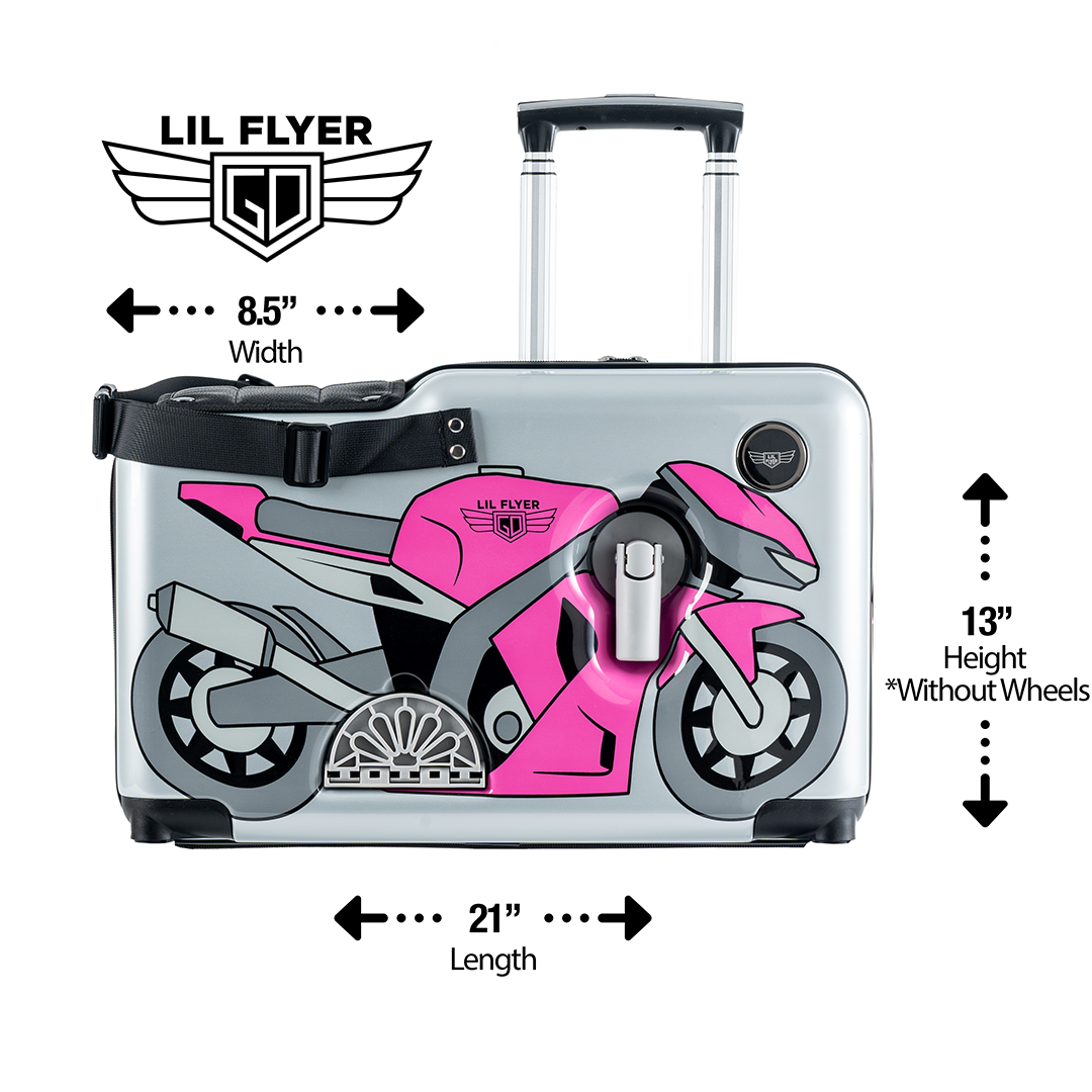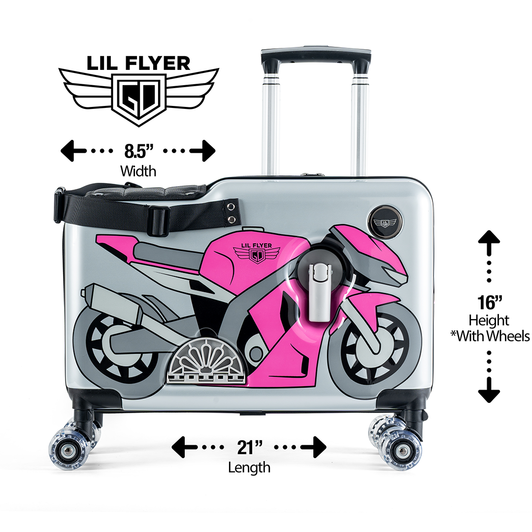 LIL FLYER GO, Kids Favorite Ride-on Suitcase. Patent pending removable spinner wheels, padded seat cushion, ruggedized spinner wheels, folding handlebars and foot pedals, and much, much more! This product is recommended for children, 2 years and up, with a max child weight of 80 lbs (23 kg). The total load capacity (child + luggage) before failure exceeds 200 lbs (90 kg).
