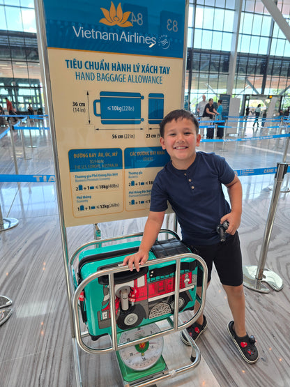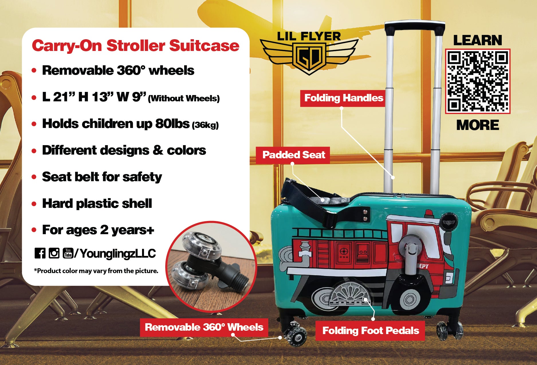Having the best luggage for your child makes travel even more fun. Our Red Firetruck LIL FLYER GO is a suitcase that your child can safely ride on. Our firetruck luggage features an adorable design on the front that will spark your child’s imagination. You can pull them through the airport or allow your little one to “take the wheel” and use their feet to push this firetruck suitcase as they ride it.