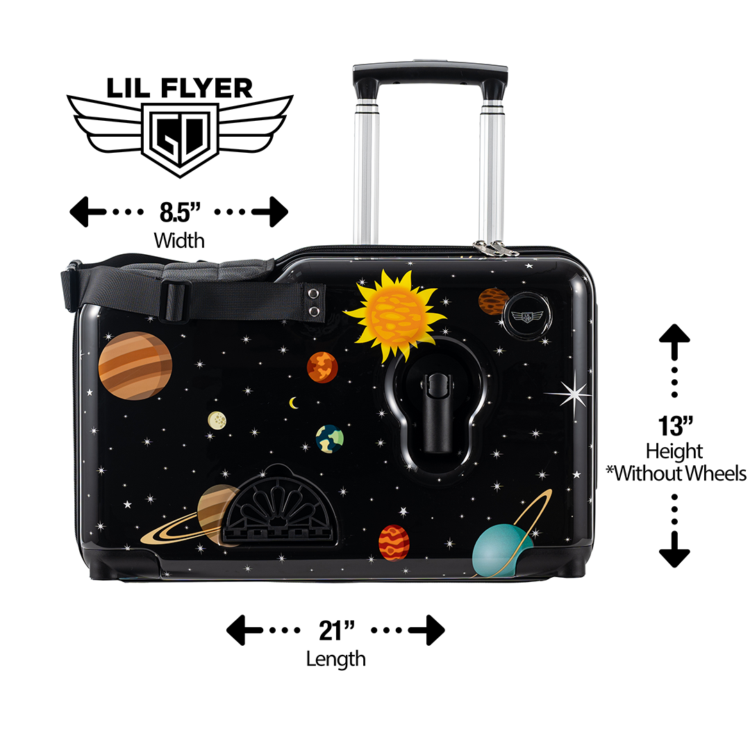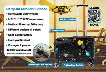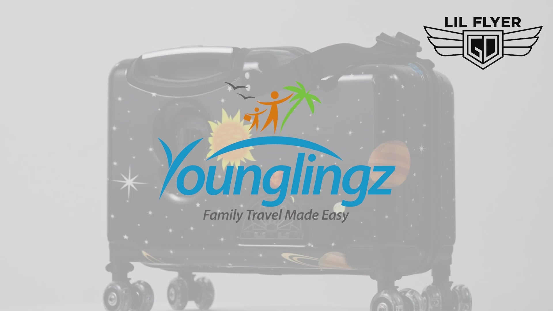 LIL FLYER GO, Kids Favorite Ride-on Suitcase. Patent pending removable spinner wheels, padded seat cushion, ruggedized spinner wheels, folding handlebars and foot pedals, and much, much more! This product is recommended for children, 2 years and up, with a max child weight of 80 lbs (23 kg). The total load capacity (child + luggage) before failure exceeds 200 lbs (90 kg).